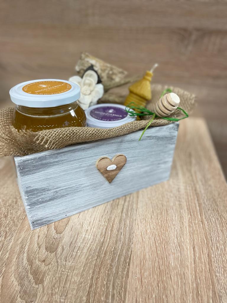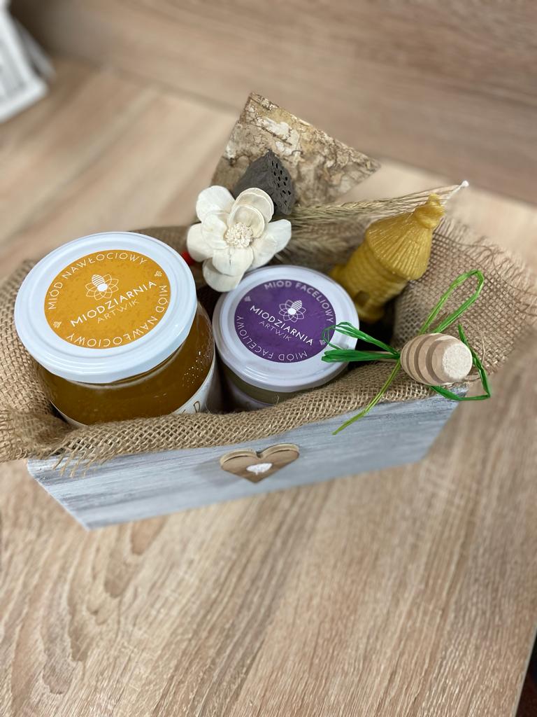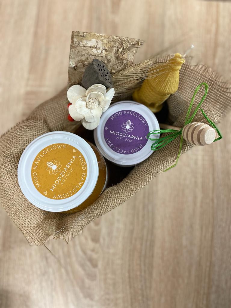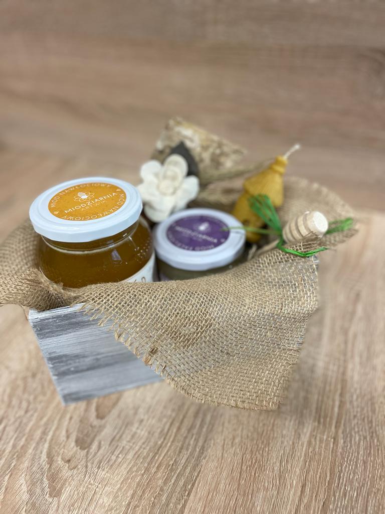 Cena zestawu obejmuje koszt dekoracji (do wyboru z proponowanej oferty) plus należy dodać nasze pyszne miody oraz produkty pszczele do wypełnienia.